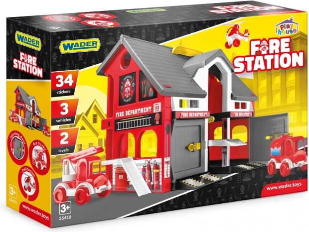 - Haus mit Fenstern und öffnenden Türen, Aufzug, Haken, Behälter für Sand und Wasser, 3 Fahrzeuge (Helikopter, Feuerwehrauto, Wassertankwagen), 34 Aufkleber
