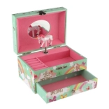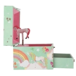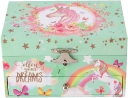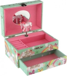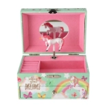 Diese stilvolle Spieluhr-Schmuckschatulle mit Einhorn ist ideal zur Aufbewahrung von Ringen, Ohrringen und kleinen Geheimnissen. Beim Öffnen des Deckels mit Spiegel beginnt sich nach dem Aufziehen des Schlüssels das weiß-rosa Einhorn zu drehen und sanfte Musik erklingt. Das Innere bietet strukturierte Fächer für Schmuck, während die untere Schublade weiteren Kostbarkeiten Platz bietet.