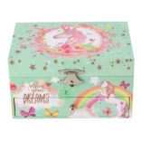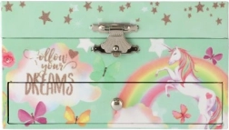 Die pastellgrüne Oberfläche ist mit Motiven von Regenbögen, Sternchen und Schmetterlingen verziert. Die Schmuckschatulle besteht aus festem Karton, ergänzt durch einen Metallverschluss und robuste Scharniere für eine längere Lebensdauer. Ein tolles Geschenk fürs Kinderzimmer – schön anzusehen und zugleich praktisch.