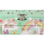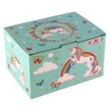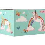 Stabiler Karton mit Metallverschluss und -scharnieren sorgt für lange Lebensdauer. Pastellgrüne Motive von Regenbogen, Sternchen und Schmetterlingen schmücken jedes Kinderzimmer wunderschön.